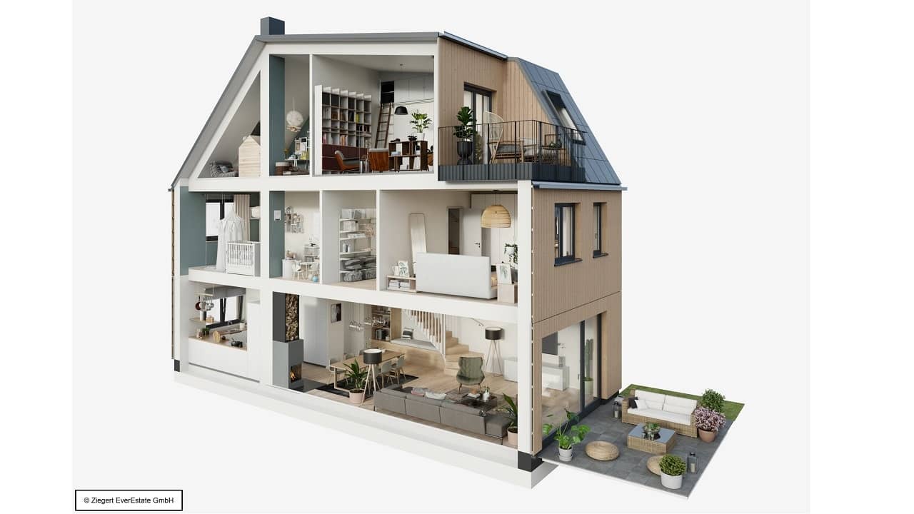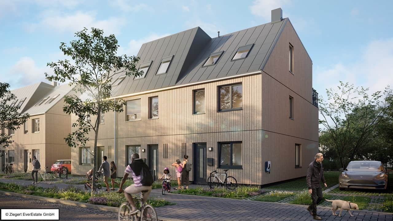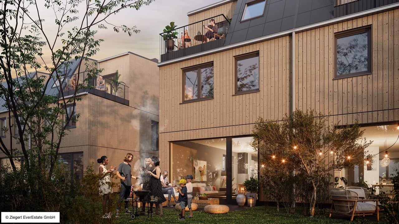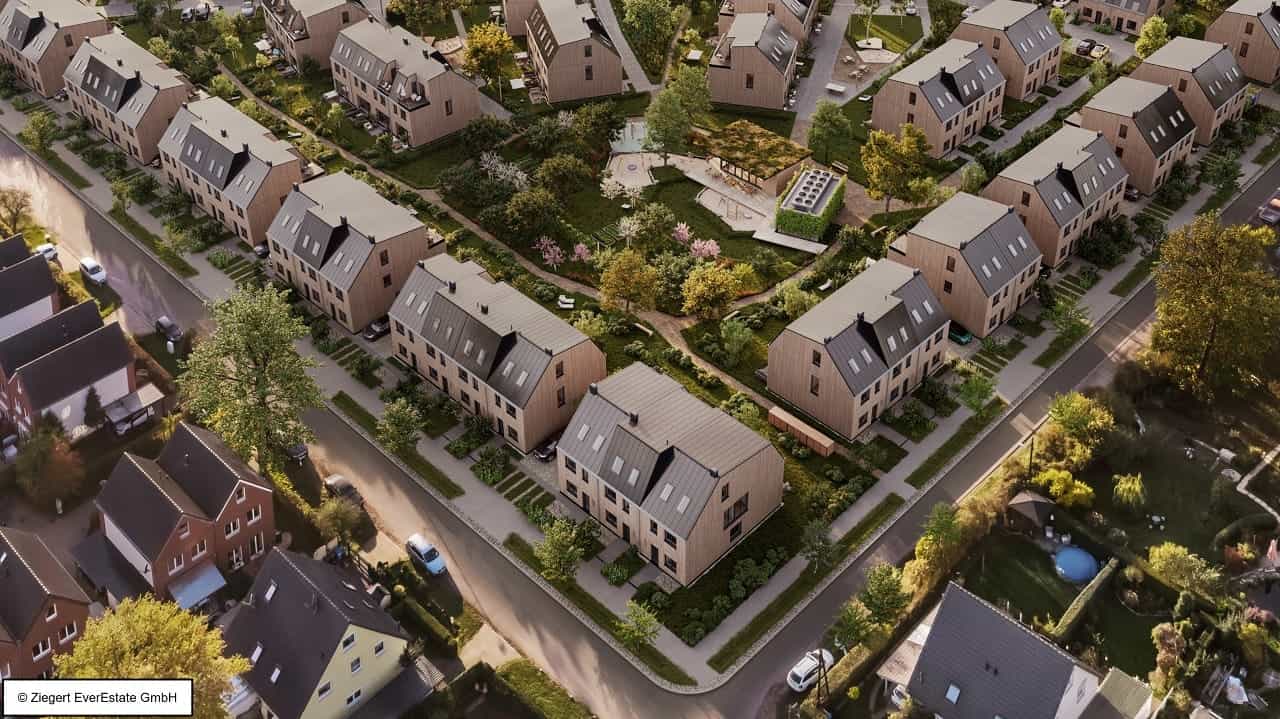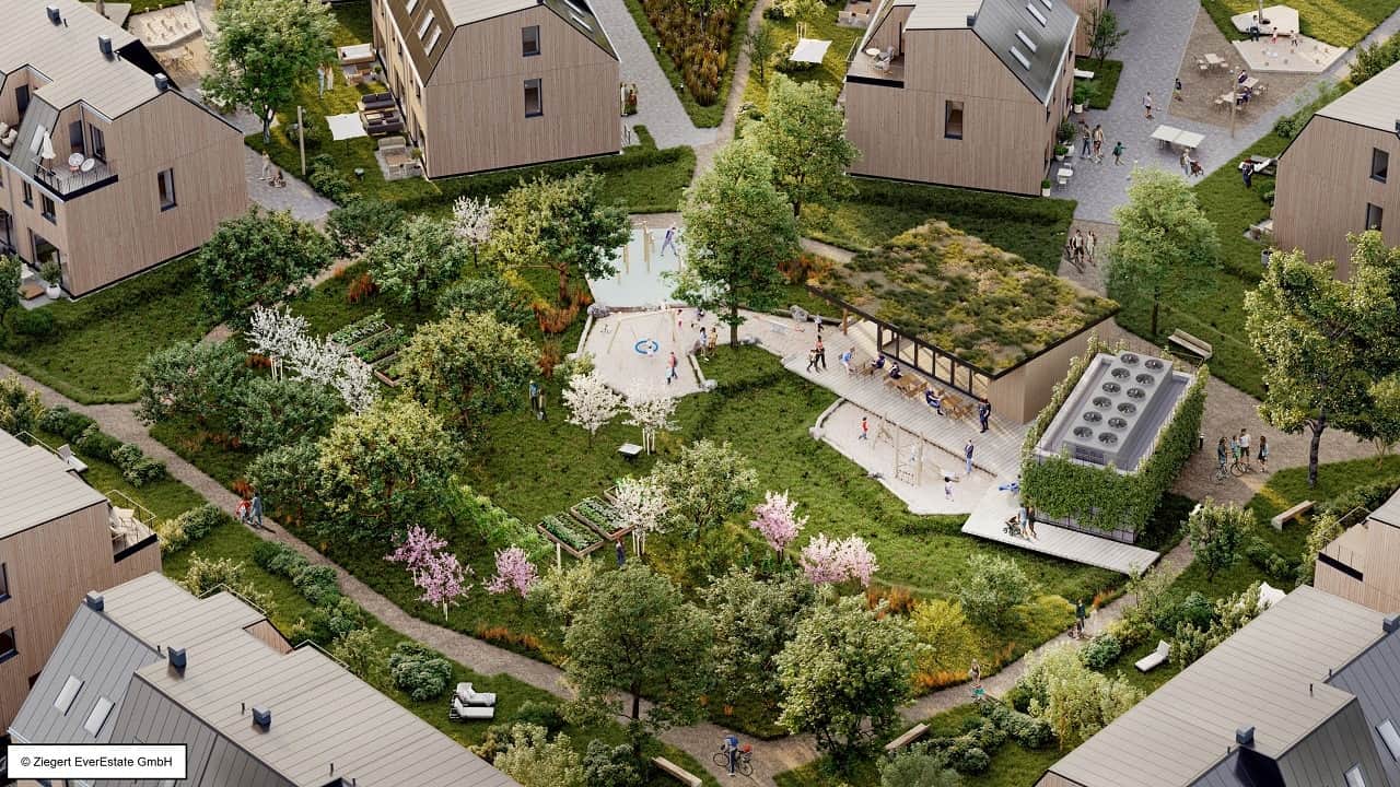 Egal ob Wallbox fürs Elektroauto oder fossilfreie Generierung von Wärme und Strom – das Quartier mit 84 Doppel- und Reihenhäusern (Holzbau) nach Effizienzhaus Standard 55 Erneuerbare-Energien-Klasse ist voll auf einen nachhaltigen Lebensstil ausgerichtet. Zentral gelegen soll ein Gemeinschaftshaus mit anliegender Energiezentrale errichtet werden.