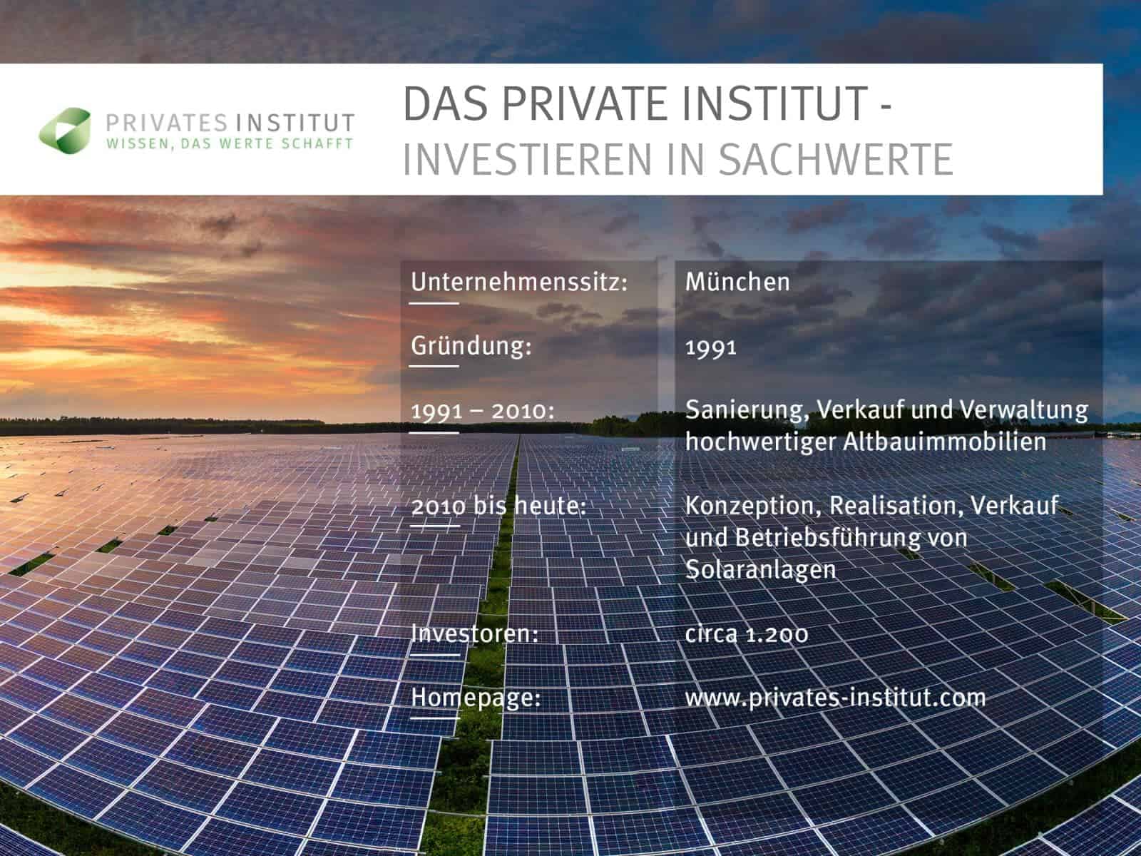 Das Private Institut ist 1991 gegründet worden. Die Gesellschaft konzipiert, realisiert und vertreibt bereits seit 2010 Photovoltaikanlagen. Daneben übernimmt das Private Institut die technische und kaufmännische Betriebsführung für über 400 Photovoltaikanlagen, verteilt auf das gesamte Bundesgebiet (www.privates-institut.com).