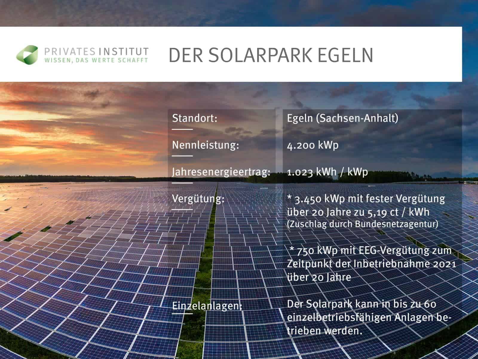Es liegen nach aktuellem Planungsstand 60 sogenannte einzelbetriebsfähige Photovoltaik-anlagen vor, welche innerhalb der nächsten zwei Jahre an Einzelinvestoren (teilweise) veräußert werden sollen. Dieses Geschäftsmodell der einzelbetriebsfähigen Teilanlagen und dem Verkauf an Einzelinvestoren betreibt das Private Institut seit 2010 erfolgreich und hat mittlerweile über 1.200 Kunden in seinem Bestand.