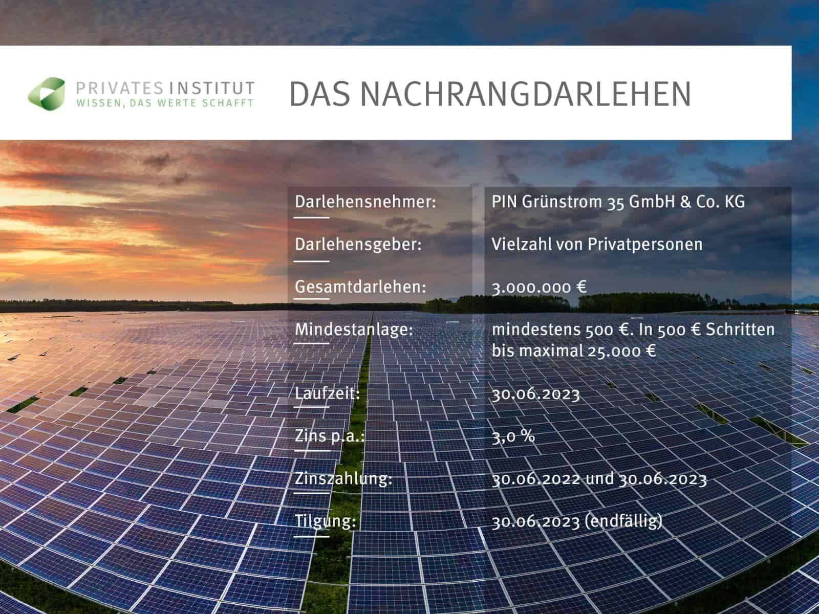 Die Laufzeit der Nachrangdarlehen endet vertragsgemäß zum 30.06.2023. Der Darlehensnehmer (PIN Grünstrom 35 GmbH & Co. KG) hat das Recht, mit einer Frist von einem Monat zum Monatsende das Darlehen zu kündigen, erstmalig jedoch zum 30.06.2022.